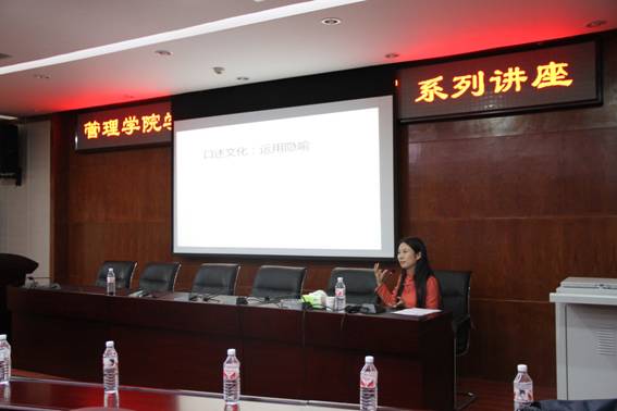 副经理朱文莉首先代表管理学院全体师生对杨素秋博士的到来表示热烈欢迎,并介绍了杨素秋博士简况。杨素秋博士以信息的传播进程为引言,从口述文化、印刷文化到图像文化的文化传播过程给所有在场师生做了深入浅出的解说,杨素秋博士基于当代信息快速传播的快生活节奏背景下的文化传播方式,以幽默风趣的方式对“娱乐时代” 里的读书生活做了详细的介绍,让在场的师生对在“娱乐时代”如何读书、读什么书、怎样选好书等方面有了更多的了解。