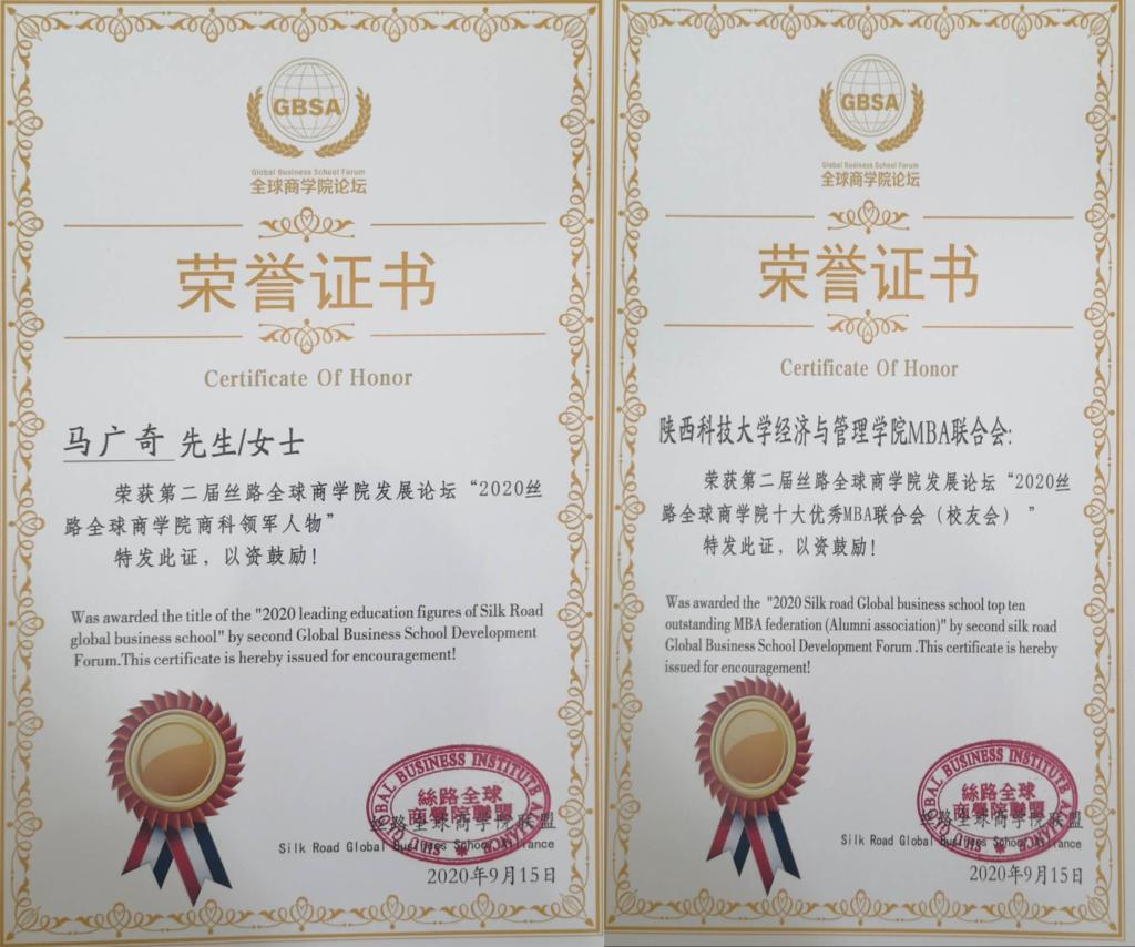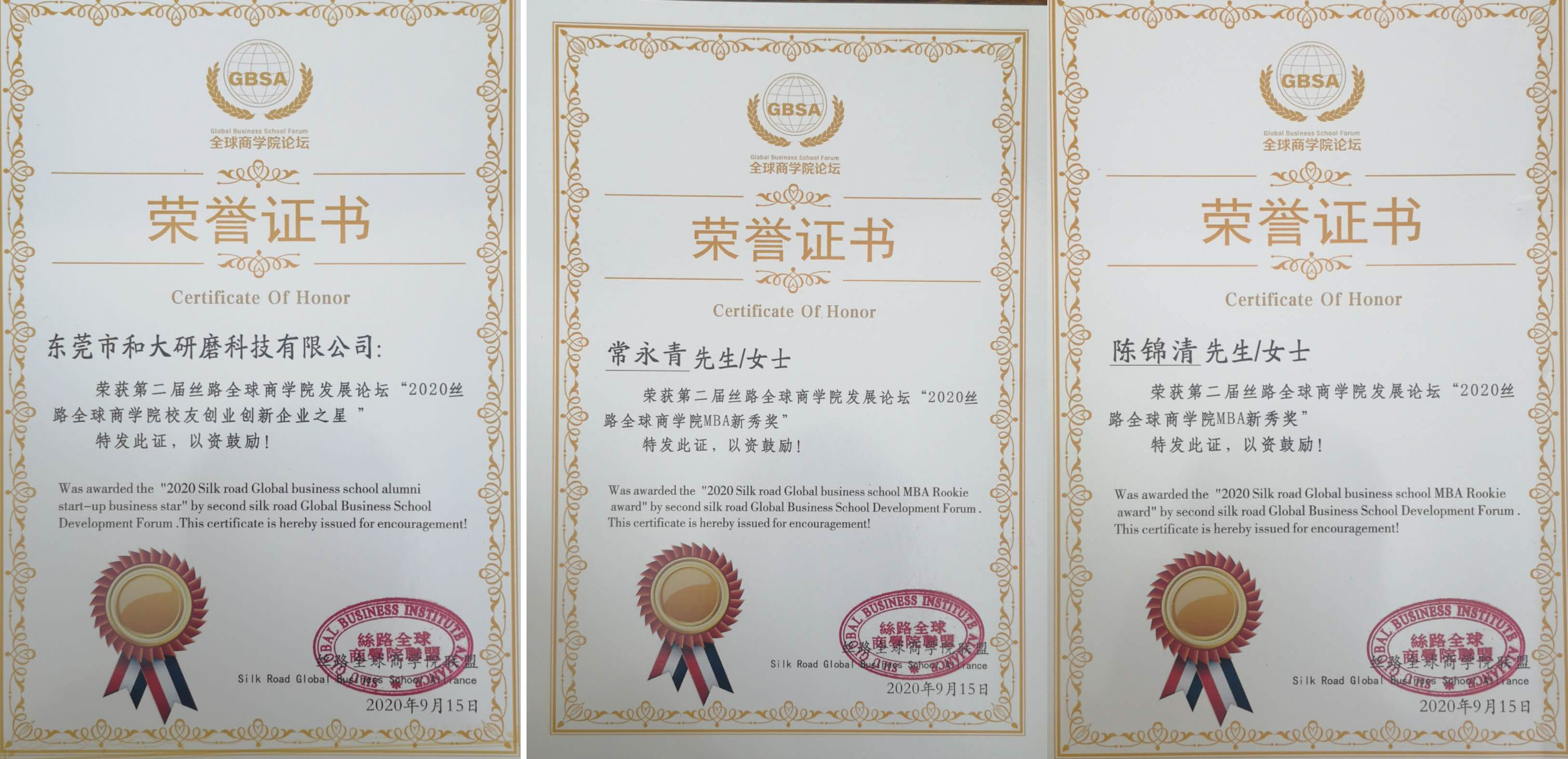 大会还对近年来在西安硬科技和经济发展做出智慧贡献的商学院进行评审。公司共荣获五项奖励,其中经理马广奇教授荣获“2020丝路全球商学院商科教育领军人物”,公司“MBA联合会”获得“2020丝路全球商学院十大优秀MBA联合会(员工会)”,由公司MBA学员常永青创立的东莞市和大研磨科技有限公司被评为“2020丝路全球商学院MBA员工创业企业新星”,学员常永青、陈锦清分别荣获“2020丝路全球商学院MBA新秀奖”单项奖励。